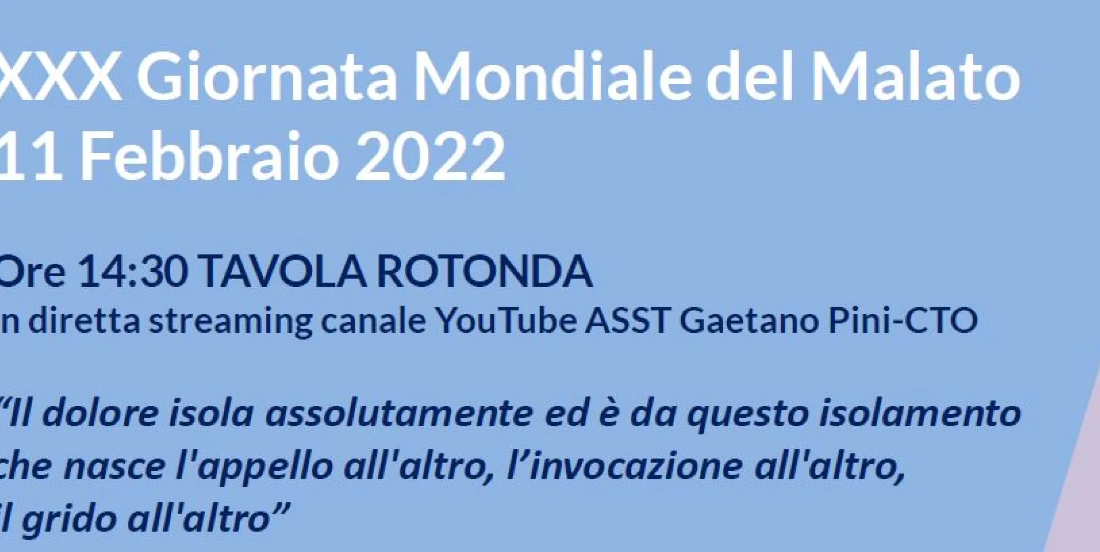 Evento ASST - Compie 30 anni la Giornata Mondiale del Malato voluta da Papa Giovanni Paolo II come "occasione per crescere nell’atteggiamento di ascolto, di riflessione e di impegno fattivo di fronte al grande mistero del dolore e della malattia". Per l'occasione l'ASST Gaetano Pini-CTO organizza una tavola rotonda che sarà trasmessa a partire dalle ore 14.30, in streaming sul canale YouTube aziendale (LINK)