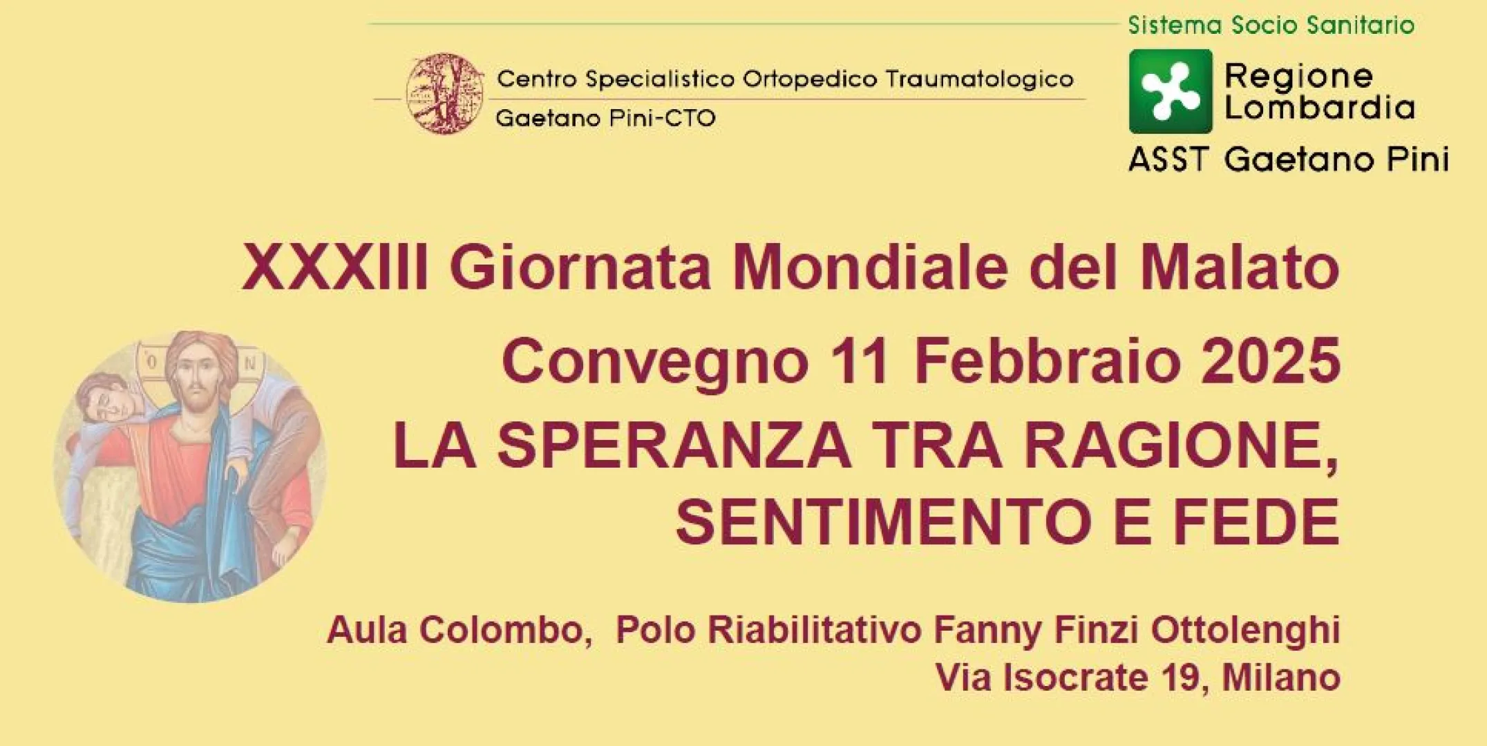 Martedì 11 Febbraio, in occasione della XXXIII Giornata Mondiale del Malato, l’ASST Gaetano Pini-CTO organizza il Convegno “La Speranza Tra Ragione, Sentimento e Fede” che si svolgerà dalle 14 alle 17 presso l’Aula Colombo, Polo Riabilitativo Fanny Finzi Ottolenghi (Via Isocrate 19, Milano), per riflettere insieme sul concetto di Speranza in senso religioso, etico e scientifico.