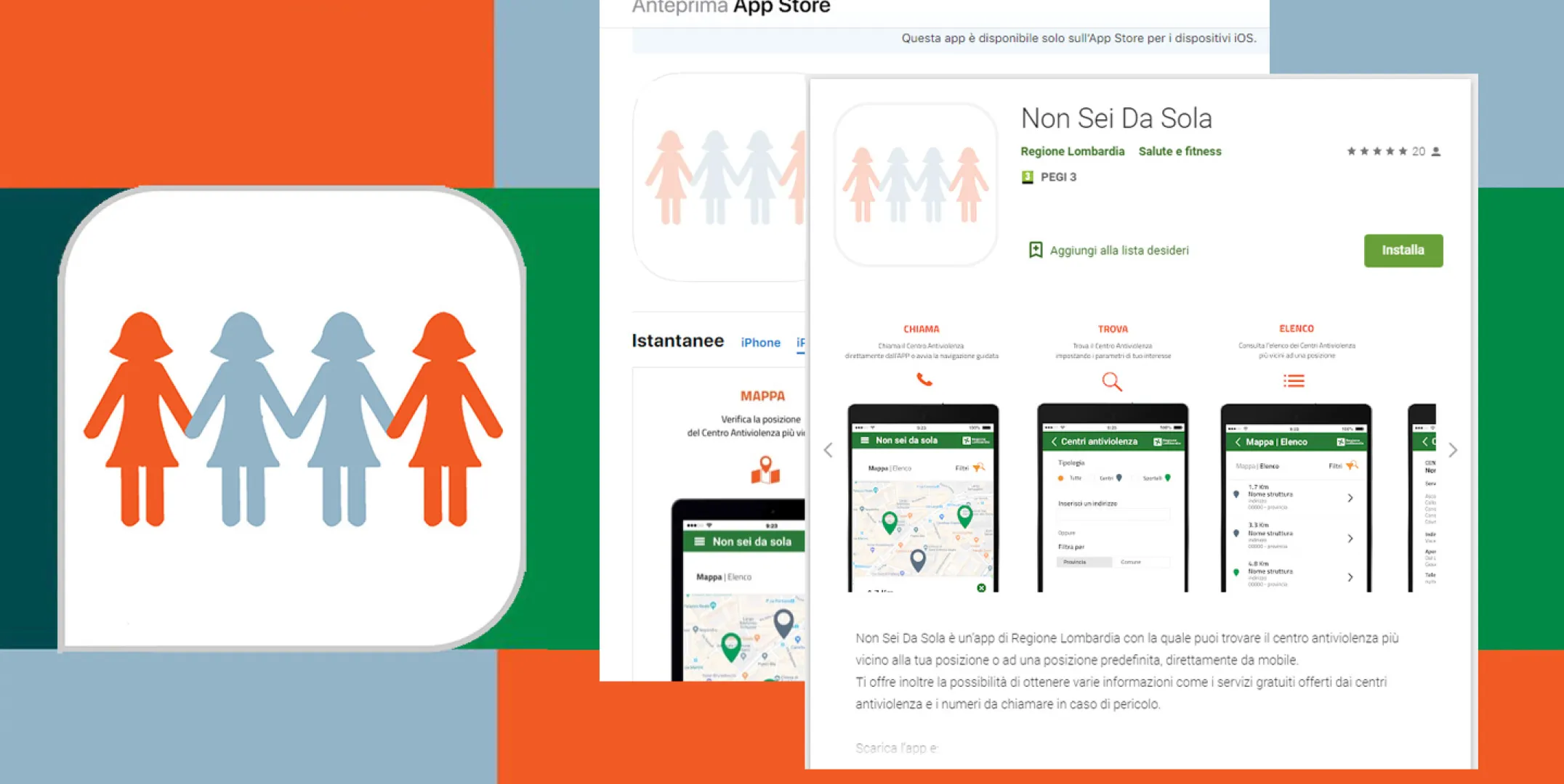 Tra i più recenti strumenti attivati c’è l’applicazione NonSeiDaSola con la quale le donne, i cittadini, gli operatori sanitari e le forze dell’ordine possono ricercare attraverso un sistema di geolocalizzazione i centri antiviolenza e gli sportelli più vicini all’utente. Tra le sue funzionalità, oltre ad aiutare le donne in pericolo a ottenere le indicazioni dei centri antiviolenza e degli sportelli più vicini e visualizzare i servizi offerti, i numeri telefonici e le modalità per raggiungerli, NonSeiDaSola è in grado di inviare messaggi predefiniti a tre mittenti predisposti dell’utente per segnalare una situazione di pericolo.