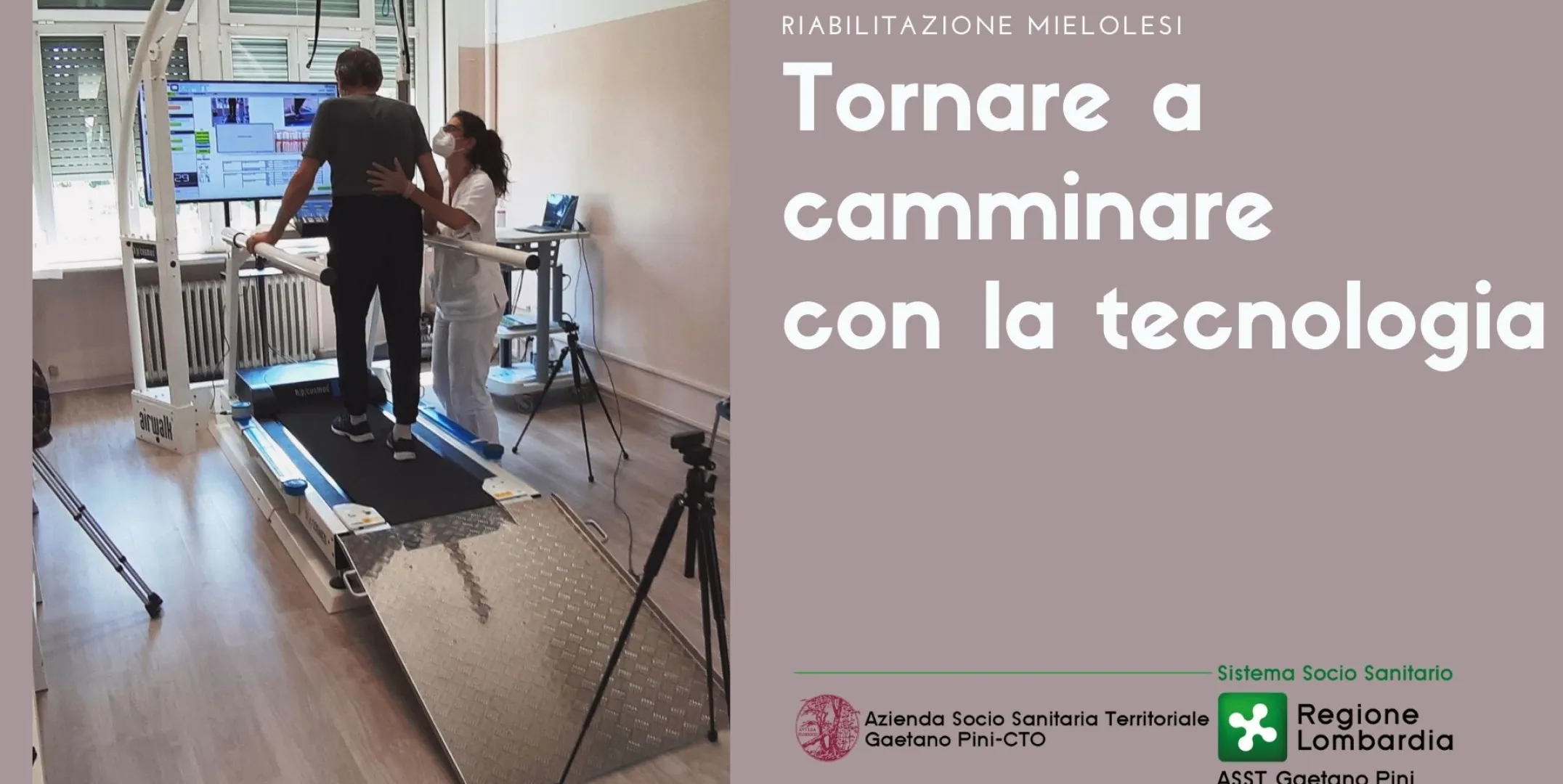 Milano, 1 luglio 2021 –“Il paziente, non da molto, è tornato a deambulare, nonostante la lesione spinale, grazie sì a tanta fortuna, ma anche alla costanza e all’impegno di tutti gli operatori sanitari che si occupano dei percorsi di riabilitazione dei pazienti mielolesi”. Comincia con questo commento la ‘passeggiata' di Michele[1] sul nuovo Treadmill HP Cosmos Airwalk: un innovativo tapis roulant installato nel reparto mielolesi dell’ASST Gaetano Pini-CTO, allo scopo di offrire ai pazienti un percorso di cura sempre più efficace. Lo strumento si distingue in quanto è dotato di un dispositivo di supporto del peso corporeo e protezione anti-caduta che permette di svolgere il trattamento riabilitativo in sicurezza. “L’apparecchiatura – spiega il dott. Antonello Caserta, Direttore della UOC Riabilitazione Mielolesi al Presidio CTO – possiede anche un sistema di analisi del passo che, tramite delle telecamere e dei rilevatori di movimento collegati al computer, registra i parametri relativi alle fasi del passo ottenendo una rilevazione in tempo reale dello schema motorio del paziente durante il cammino”. Grazie al sistema di feedback è possibile quindi allenare il cammino e analizzare l’andamento del programma riabilitativo stesso nel corso del tempo tramite test specifici presenti nel sistema di analisi del computer collegato al Treadmill.